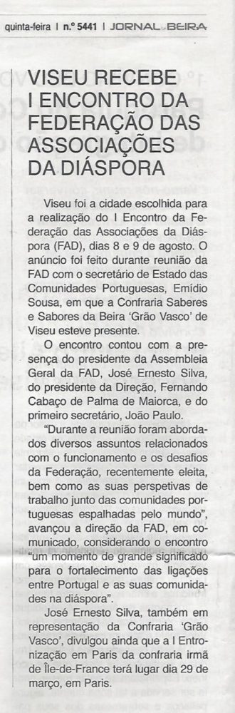 Na ocasião, José Ernesto Silva, enquanto Presidente da Mesa da Assembleia Geral e em representação da Confraria, aproveitou para convidar o Senhor Secretário de Estado das Comunidades Portuguesas para a I Entronização em Paris da confraria irmã — Confraria de Saberes e Sabores da Beira Grão Vasco de Île-de-France — que terá lugar no próximo dia 29 de março, em Paris, convite que foi prontamente aceite.
